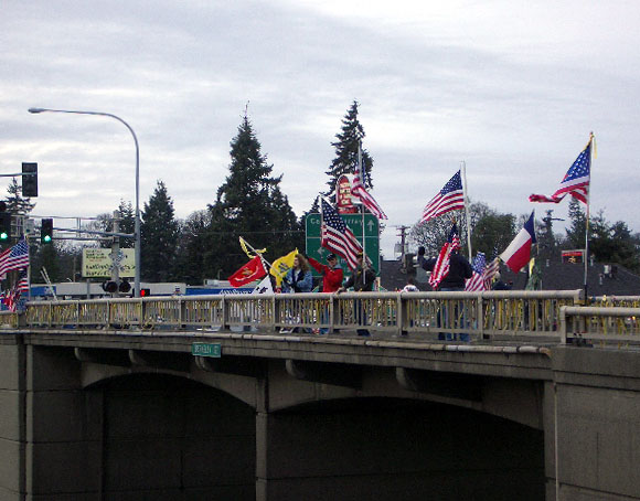 | A Support the Troops rally at an I-5 overpass near Fort Lewis, south of Seattle... |