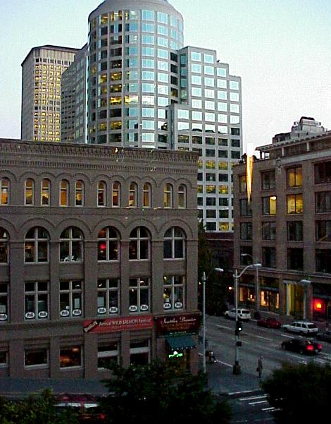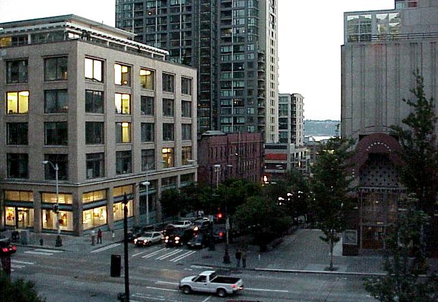 The view from within Benaroya Hall... one can look out toward the Sound and see ferry boats coming and going, and West Seattle in the distance... |