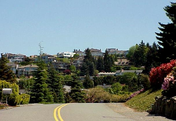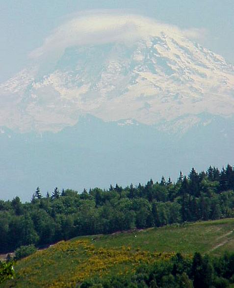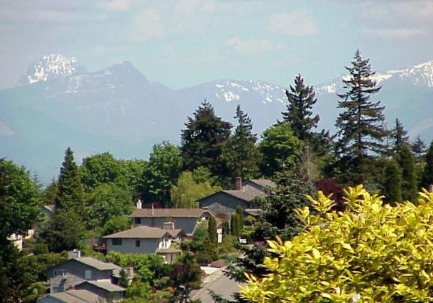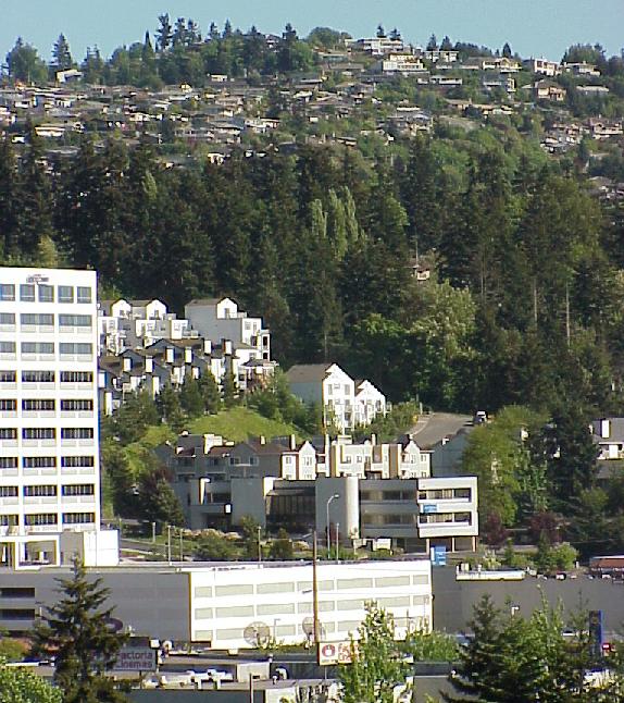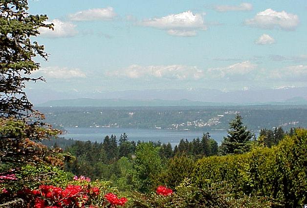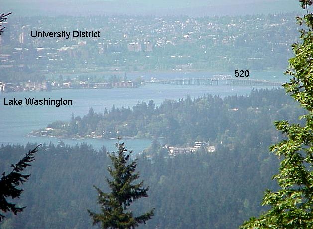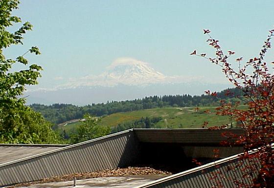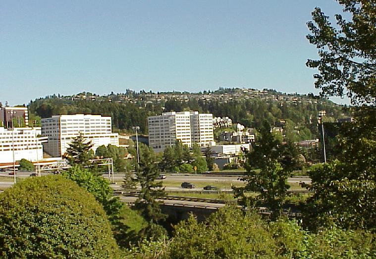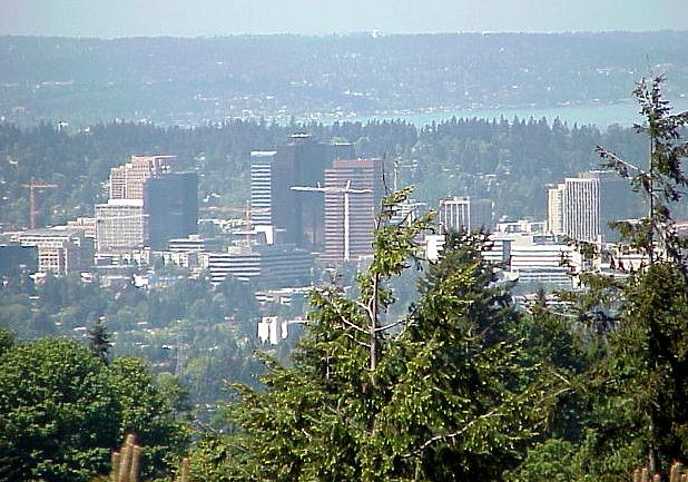 and the junction of I-90 and I-405. Downtown Seattle is to the west, the Cascade range forms a snowcapped wall to the east, and Mount Rainer rises to the south...