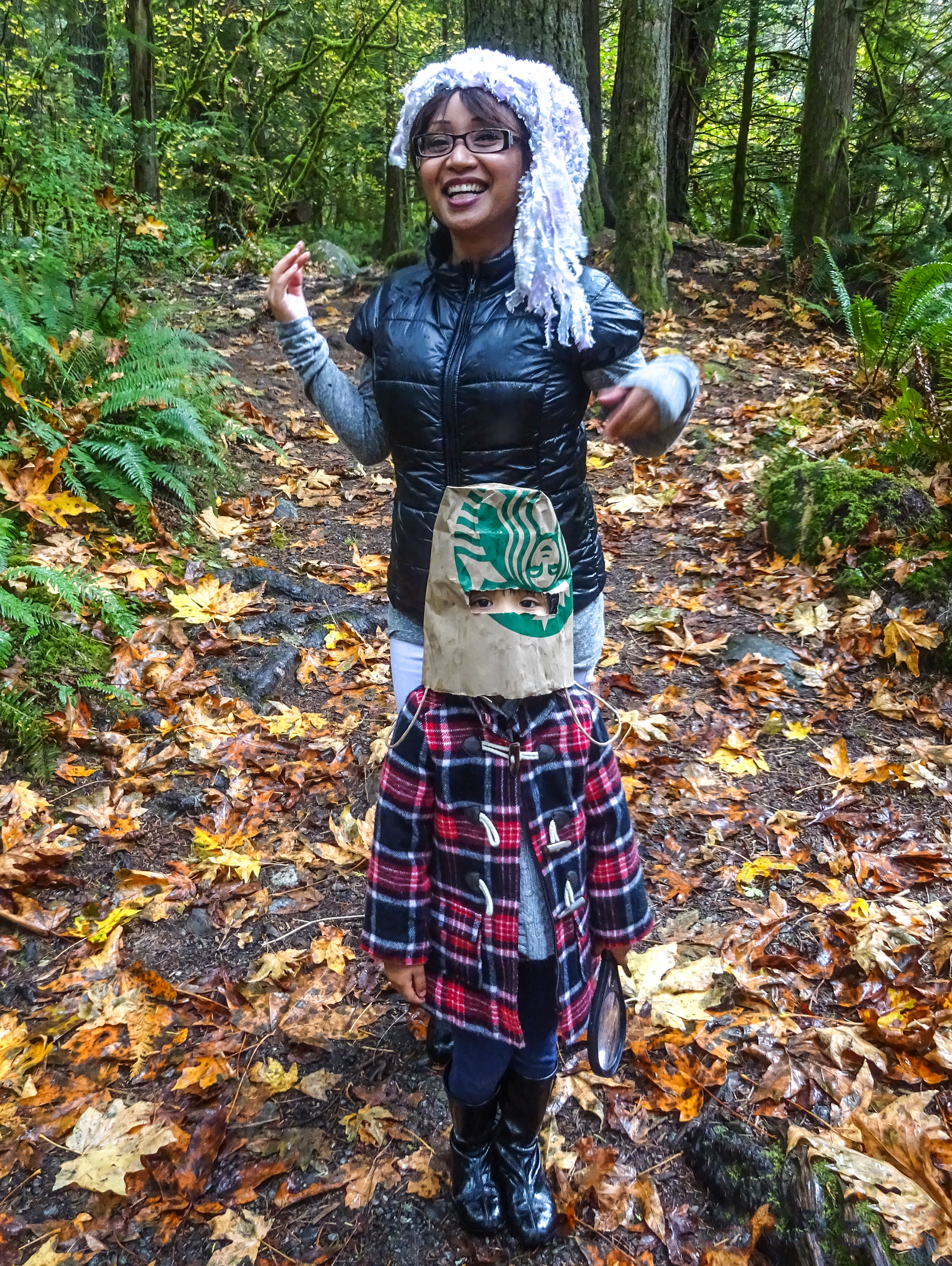The Starbucks bag that Geneva brought along to hold any interesting artifacts found along the way was re-purposed into a drizzle hat! |